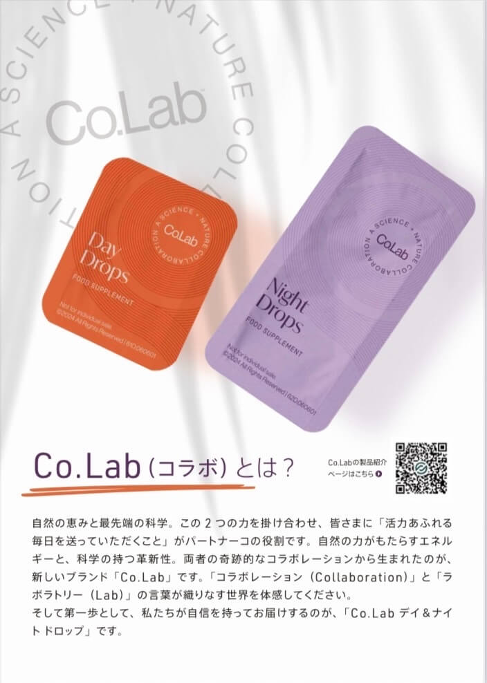 自然の恵みと最先端の科学。この2つの力を掛け合わせ、皆さまに「活力あふれる毎日を送っていただくこと」がパートナーコの役割です。自然の力がもたらすエネルギーと、科学の持つ革新性。両者の奇跡的なコラボレーションから生まれたのが、新しいブランド「Co.Lab」です。「コラボレーション(Collaboration)」と「ラボラトリー(Lab)」の言葉が織りなす世界を体感してください。 そして第一歩として、私たちが自信を持ってお届けするのが、「Co.Lab デイドロップ&ナイトドロップセット」です。
